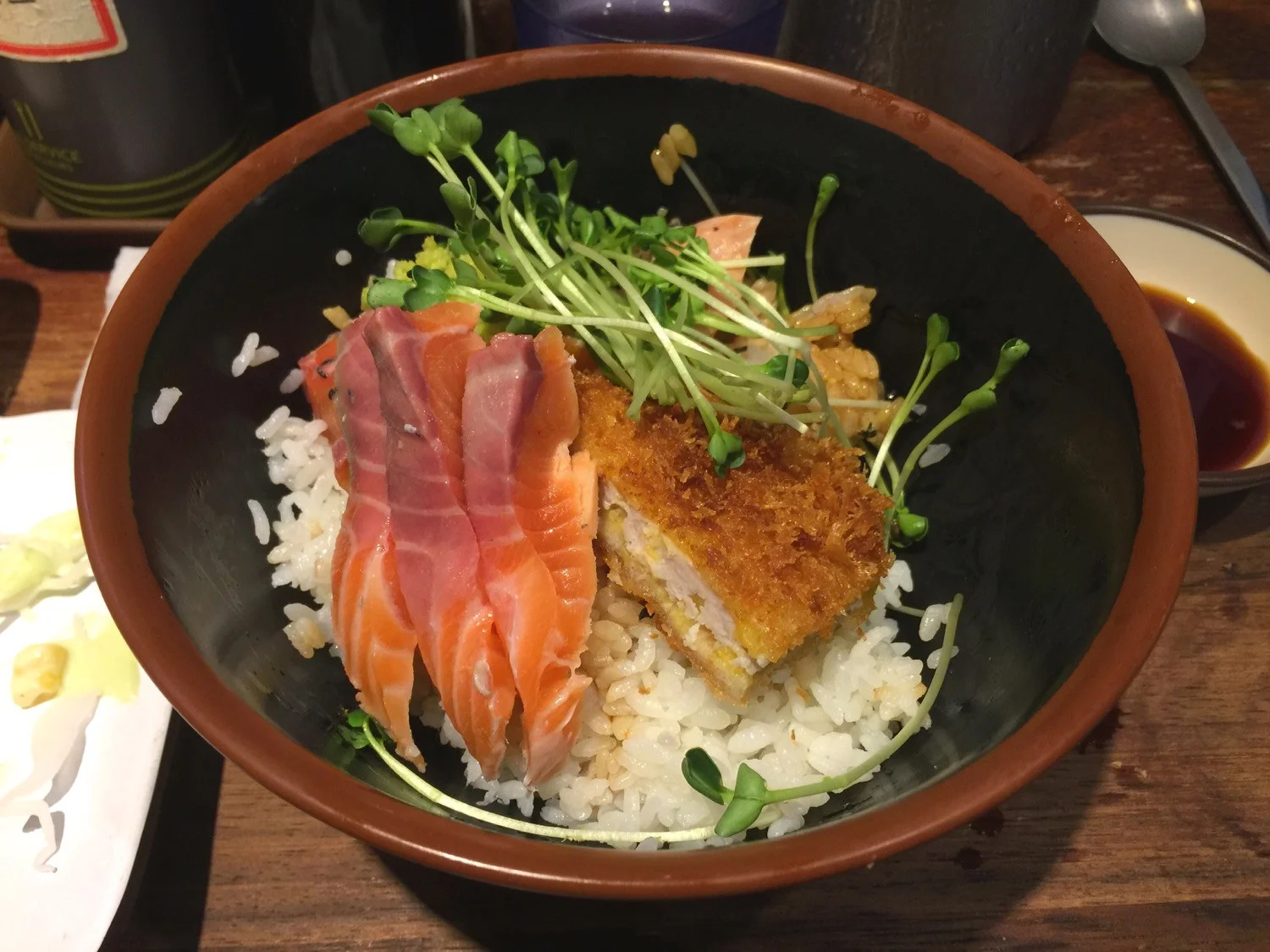 마지막 손님이었던 우리는 사케뱃살동이 다 떨어져서 어쩔 수 없이 사케동과 에비미니고로케을 먹었다.